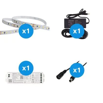 Il grande vantaggio di questo kit completo è che include tutti gli accessori necessari per installare il nastro LED a casa o in azienda. Vi forniamo il materiale necessario per installare il nastro LED. Poi si collega il tutto a una presa elettrica standard. Troverete tutte le informazioni necessarie nel nostro blog sull'installazione. Il kit comprende: